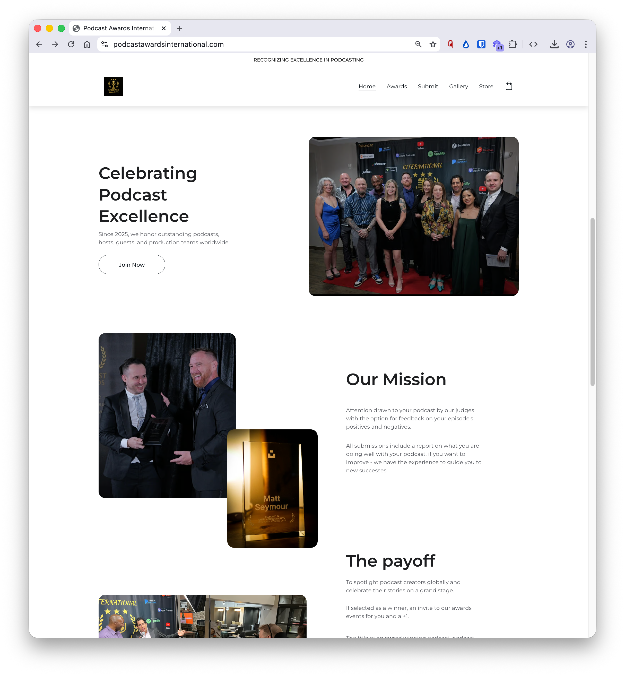 When I looked, the website’s “awards” gallery didn’t contain any of the awards given out by the International Podcast Awards. Instead, it contains a picture of the award’s “first winner”, apparently from Australia. Despite it looking as though these link to more information, they don’t.