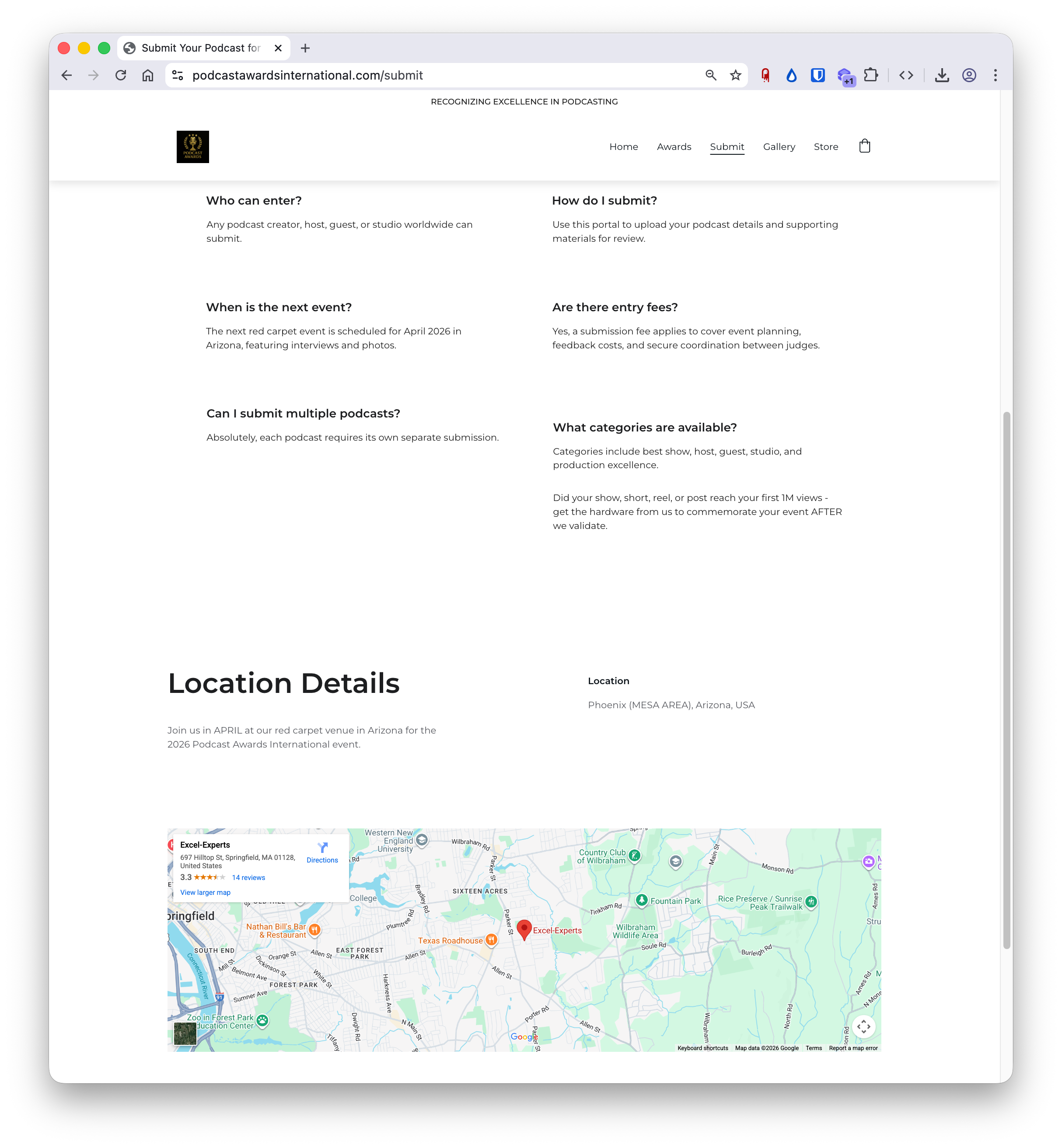 The submit page includes details of a “red carpet venue in Phoenix Arizona”, and an embedded Google map for 697 Hilltop Street, Springfield MA, an address which appears to be used on websites for variety of businesses, including a Chinese food company, a roofing company, a phsychiatrist, a beef seller, a rental company for Perth in Australia, a Bangalore-based microgreens company, a plumbing company, a pizza restaurant, a printing company, and plenty more.