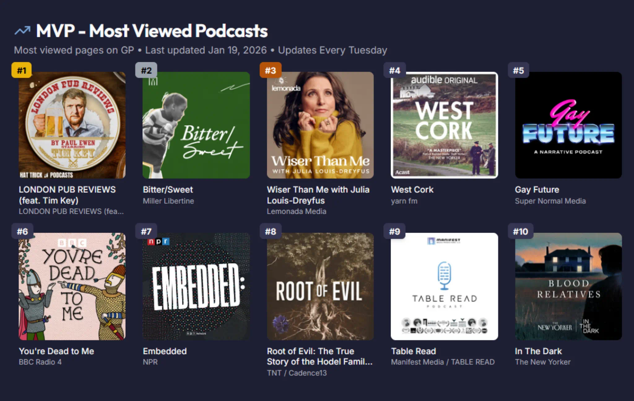- MVP (Most Viewed Podcasts) Weekly Rankings — A new weekly chart, updated every Tuesday, ranks podcasts based on real user engagement on Great Pods, not ads, self-reported downloads, or platform favoritism.