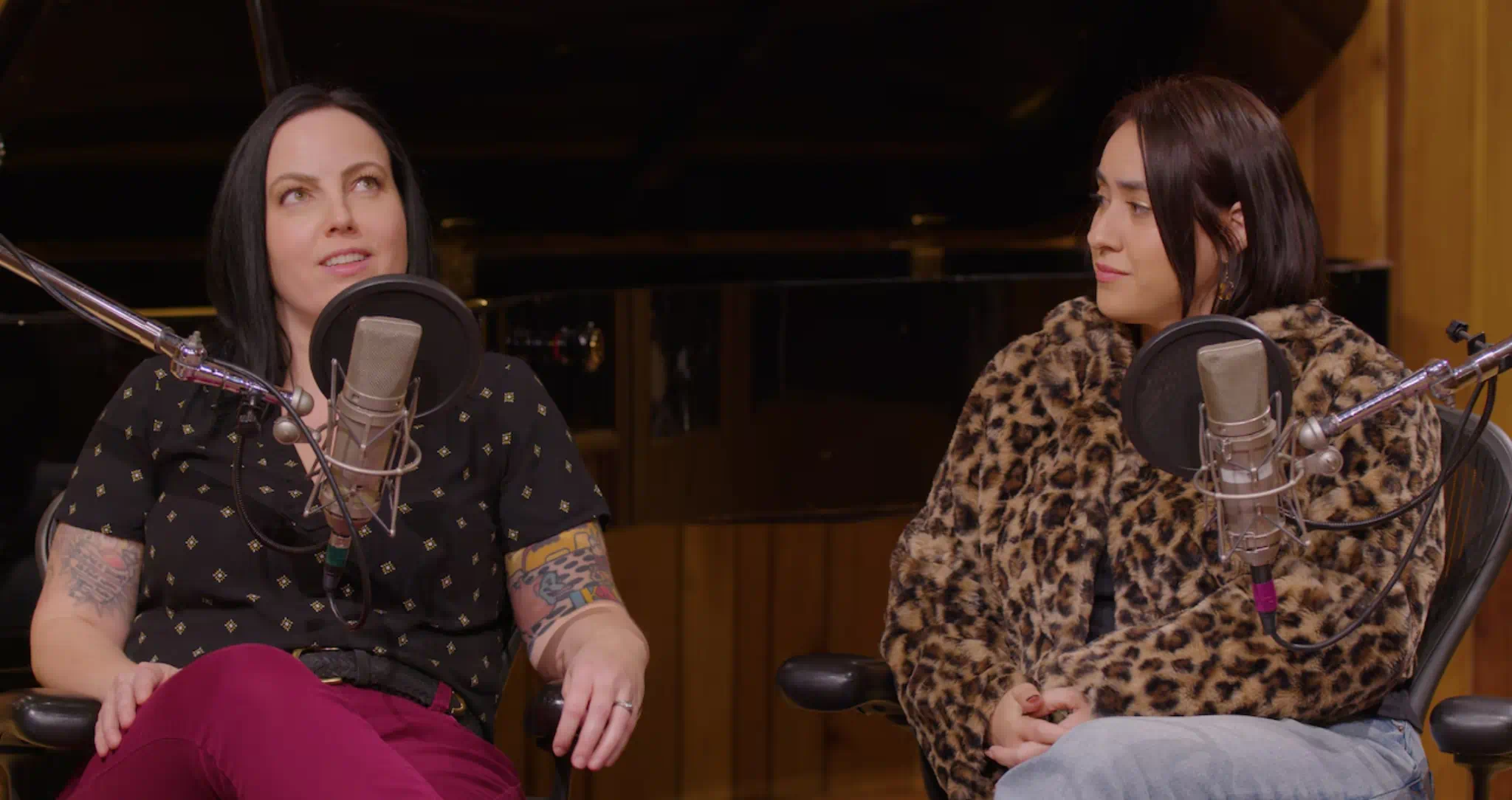 Investigative crime reporter Rebecca Everett, left, and Dayi Calavia-Robertson, a columnist covering New Jersey’s diverse communities, record a bonus episode of ’Someone’s Hunting Us’ at Sound on Sound Studios in Montclair, N.J. March 3, 2026. (Credit: James Shapiro)