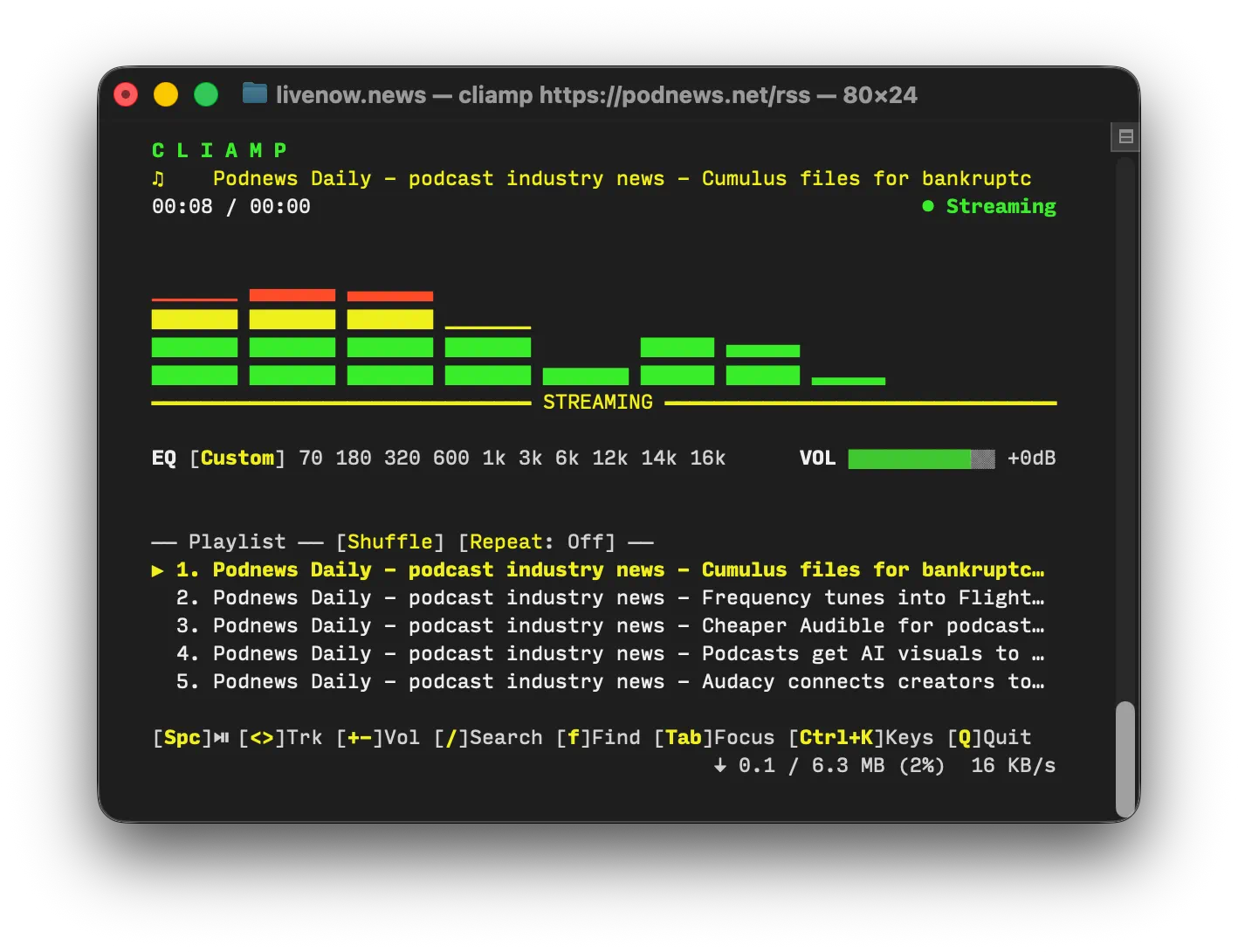 - Want a podcast and music player in a terminal window for Mac or Linux? It grabs audio from YouTube. It even deals with Spotify (if you’re premium). And of course, you can pass it an RSS URL. You’ll be wanting Cliamp. Here’s what it looks like playing our podcast.