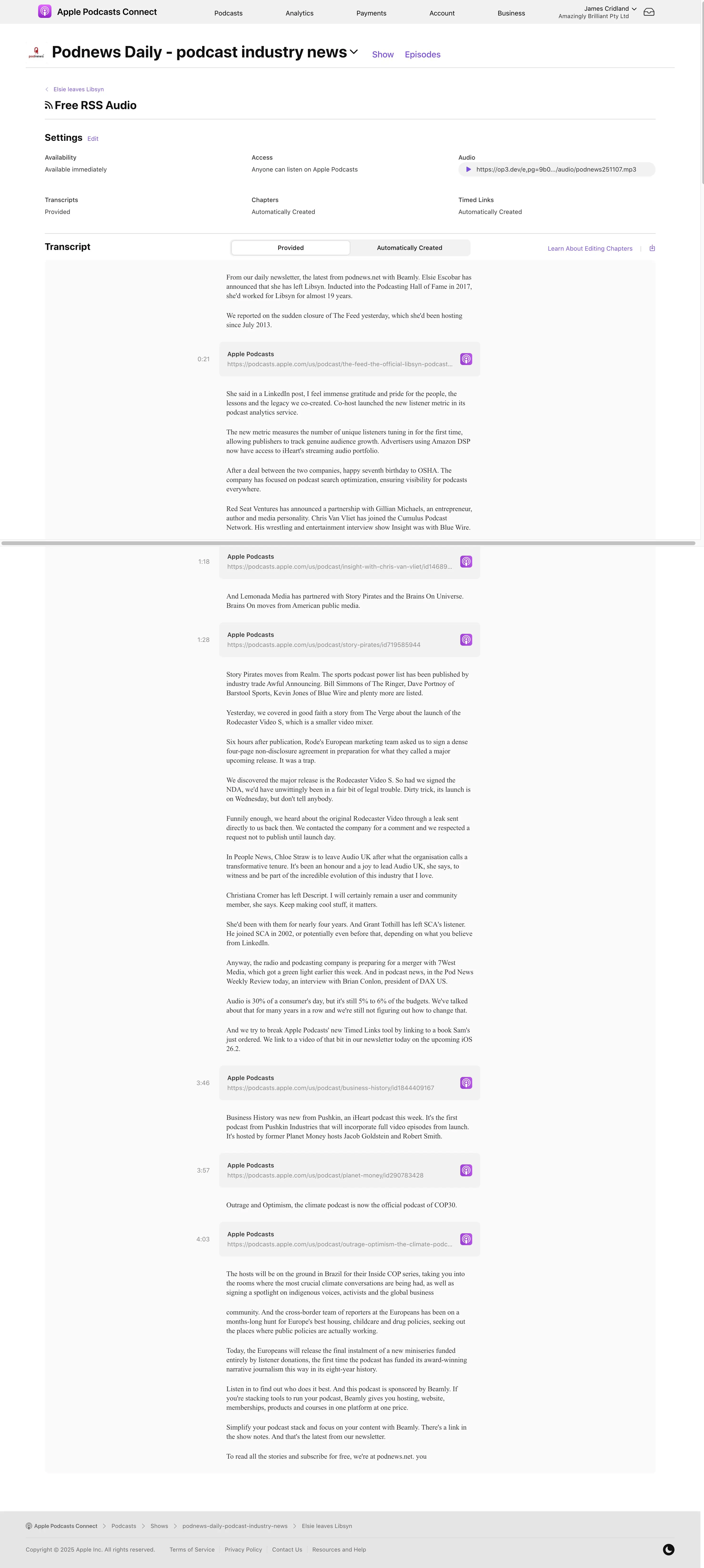 Using Android? Wondered what Apple Podcasts is showing for your transcript, and what timed links it’s picked out for your show? It turns out that Apple Podcasts Connect can now show you, like this. To find this view, log into Apple Podcasts Connect, choose “Episodes” for your show, click into the episode, and finally click the bit marked “Audio and transcripts”.