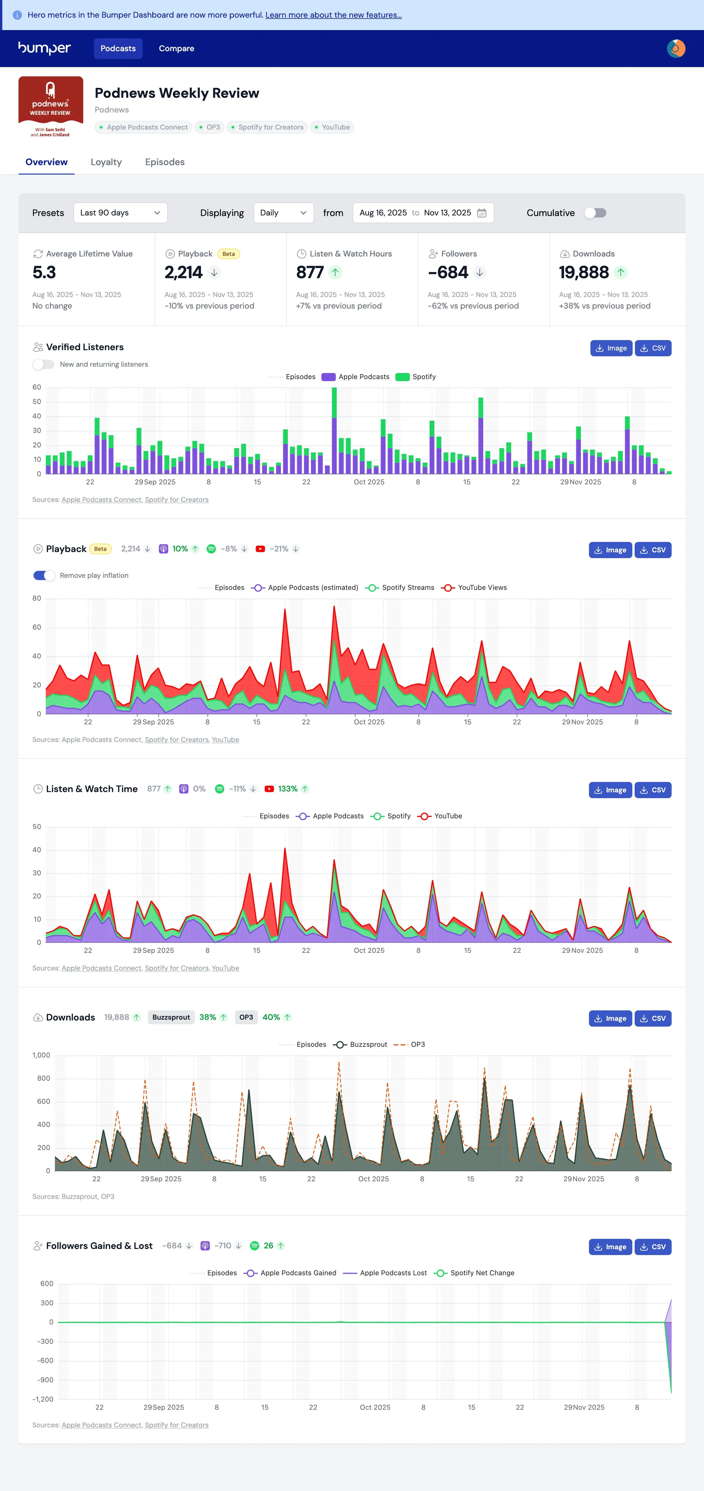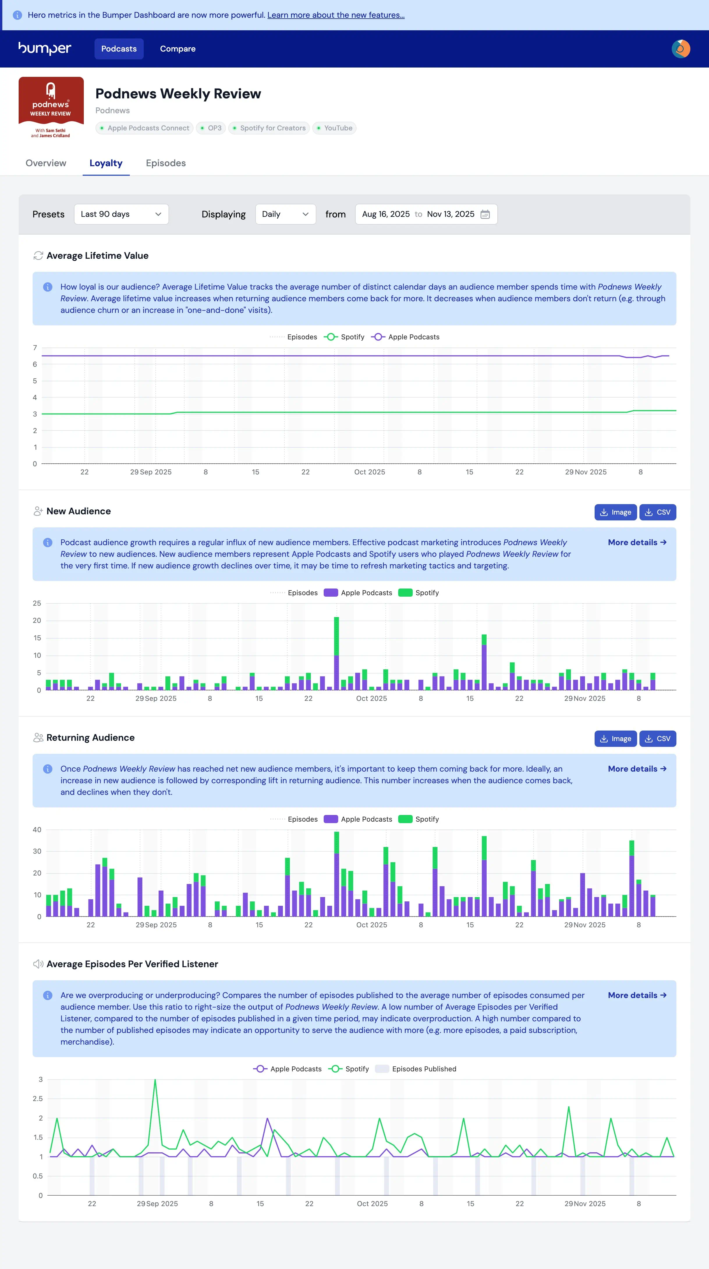 How loyal is your podcast audience? The ideal is for repeat listeners, not just tire-kickers. Dan Misener at Bumper has learned that every podcast has an average lifetime value score, which goes up and down depending on the promotion your podcast gets (and whether it’s any good). The score has been added to the Bumper Dashboard.