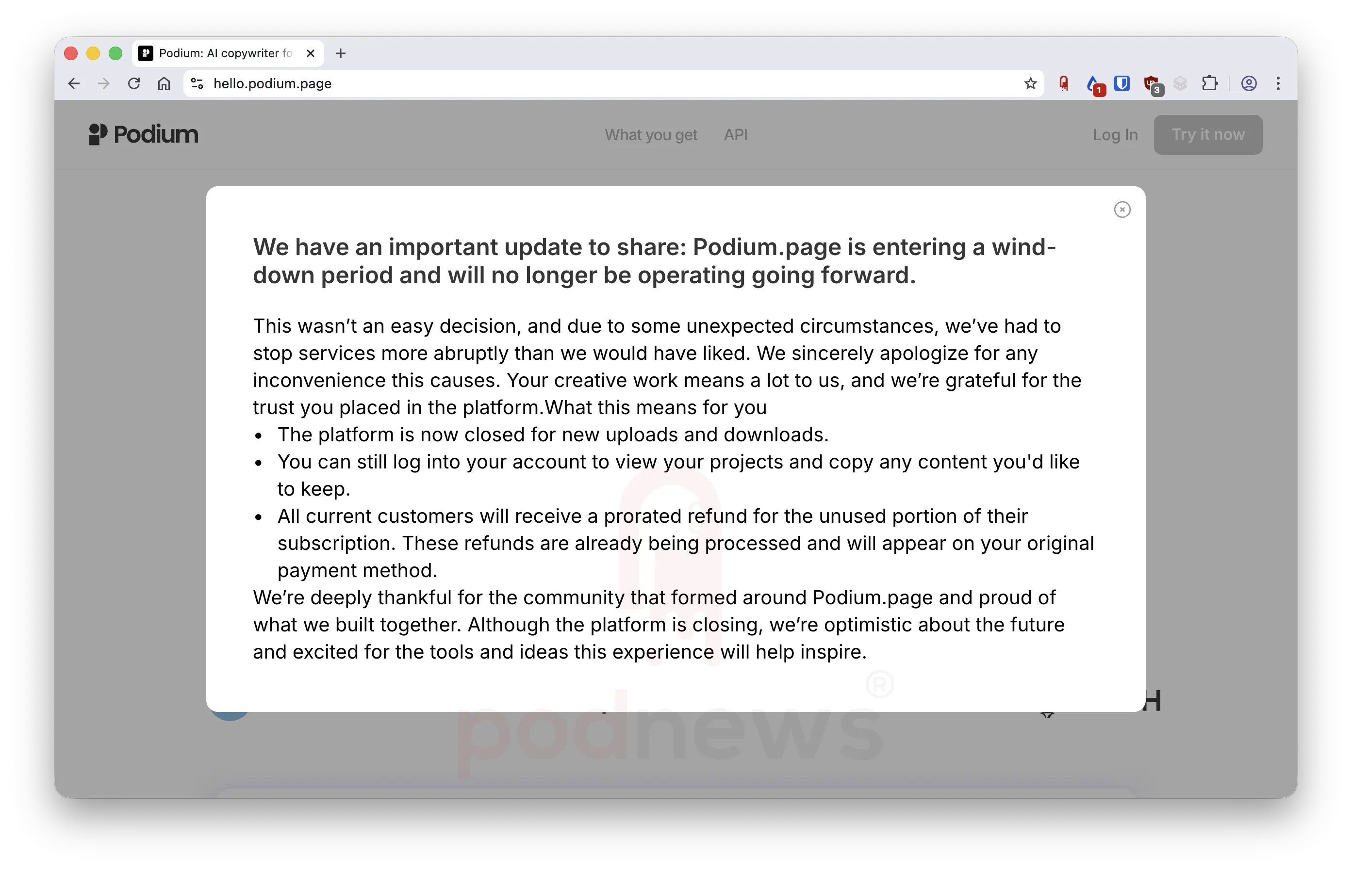 .page, a set of podcast AI tools for podcasters, has suddenly announced it is to close. The company produced transcripts and AI-written show notes and blogs, and was white-labelled by a number of podcast hosting products. - Podium