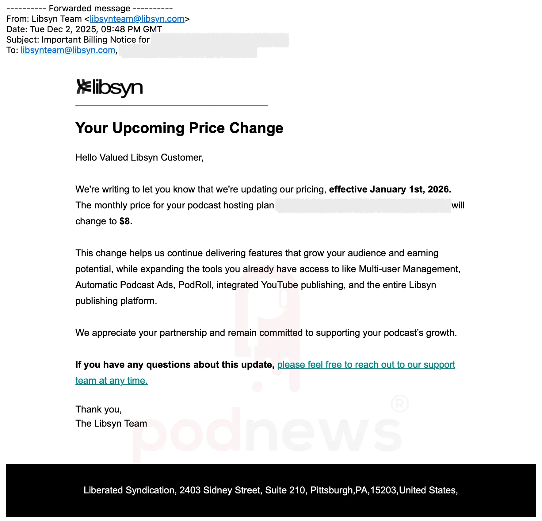 Libsyn has announced a pricing increase, via email, to some of its customers. The $5 “bare essentials” plan will change to $8/month from Jan 1. The website still says it’s $5. Regardless, we’d expect Libsyn’s other plans to also increase.